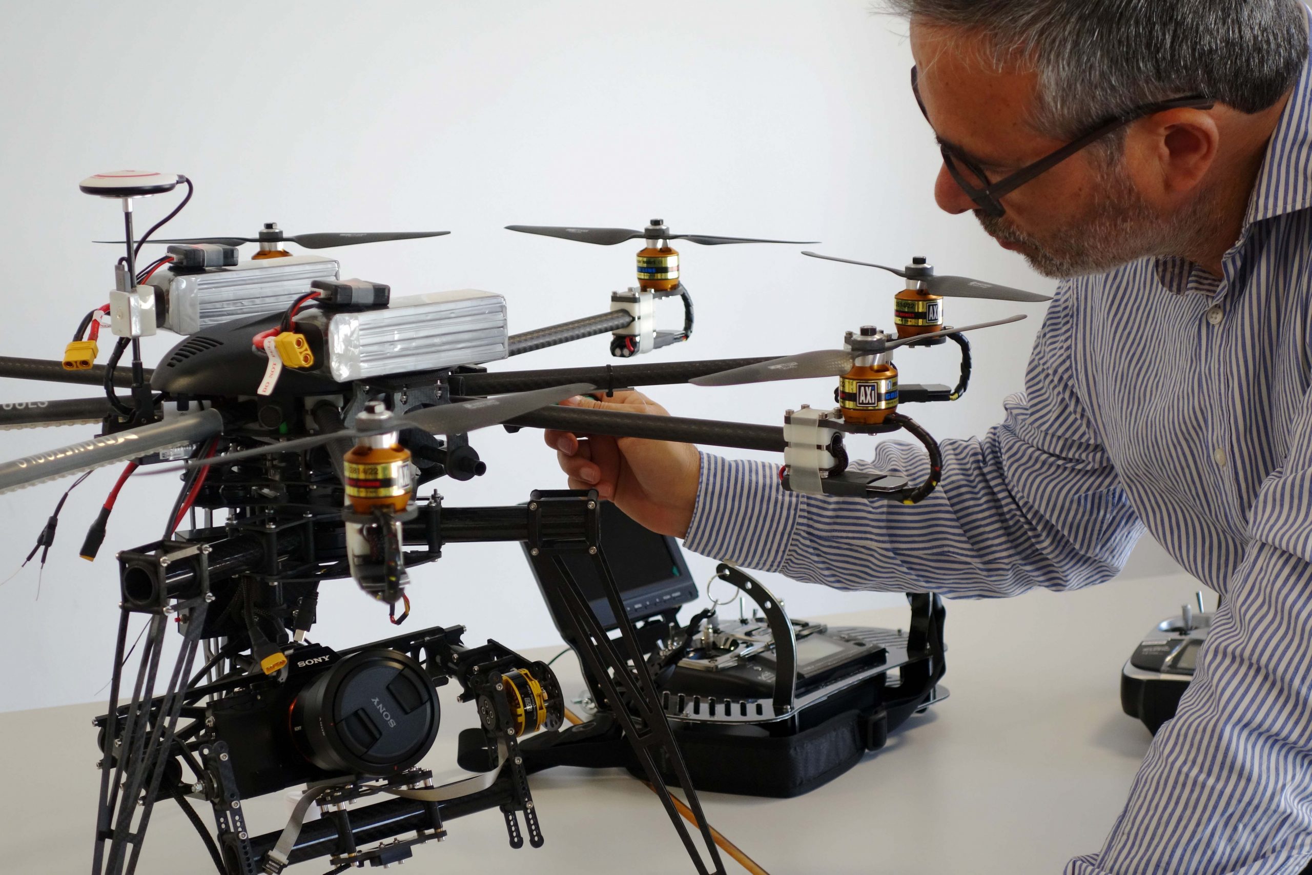 ‐ Dron Quadricóptero fabricado por Dronetools, dotado de chasis de carbono con cuatro brazos plegables, cuatro motores eléctricos tipo brushless AXi 2820/18 de 555 W de potencia, hélices de fibra de carbono huecas de 14 pulgadas de diámetro y 5 pulgadas de paso y control mediante sistema de piloto automático DJI A2. Además el dron está adaptado para transportar una montura de cámara de dos ejes (pan and tilt) en fibra de carbono, con motores brushless. Peso en vacío, 1.700 gr; peso máximo al despegue (MTOW) 3.800 gr.